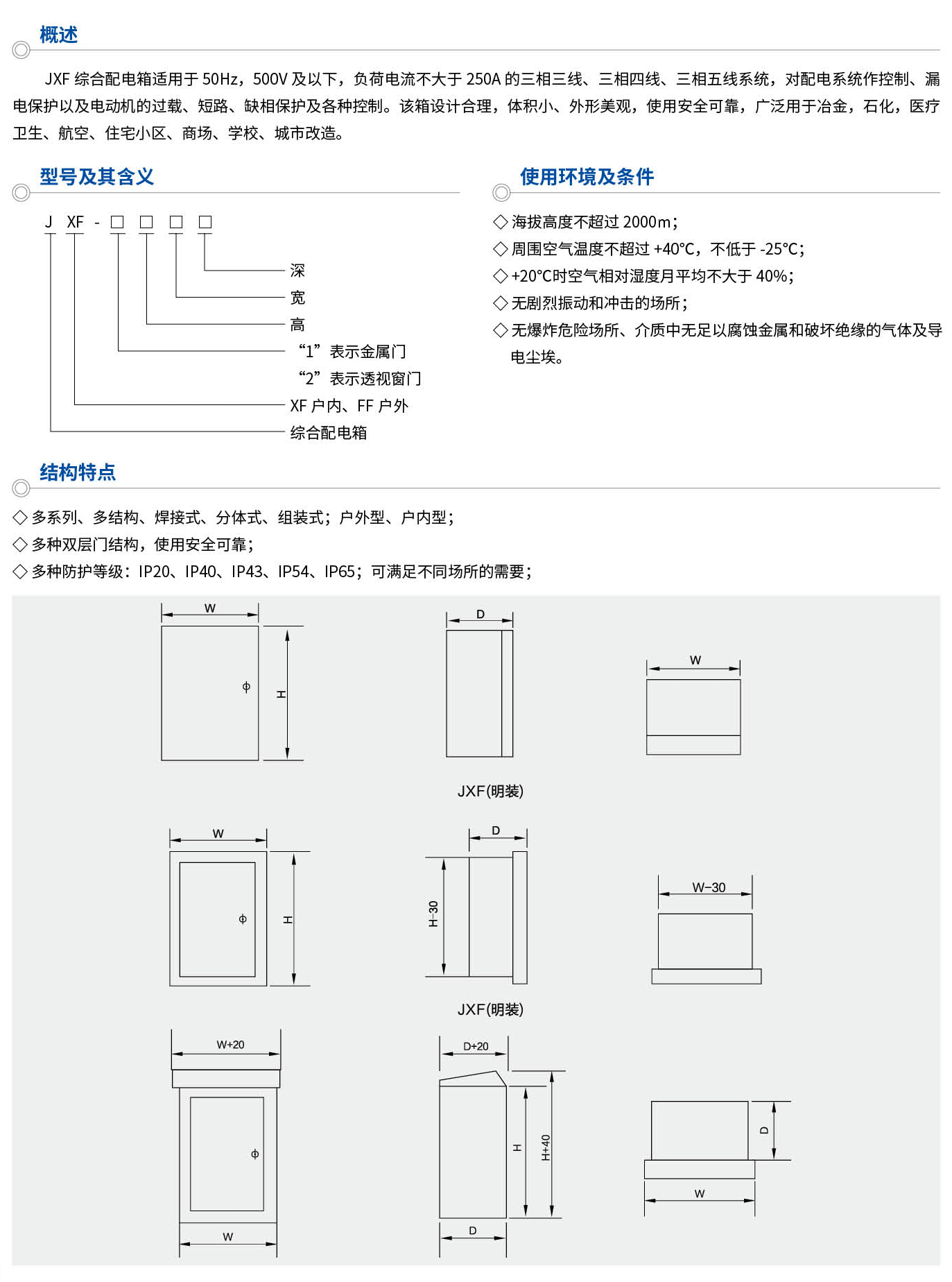JXF綜合配電箱適用于50Hz,500V及以下,負荷電流不大于250A的三相三線、三相四線、三相五線系統,對配電系統作控制、漏電保護以及電動機的過載、短路、缺相保護及各種控制。該箱設計合理,體積小、外形美觀,使用安全可靠,廣泛用于治金,石化,醫療衛生、航空、住宅小區、商場、學校、城市改造。